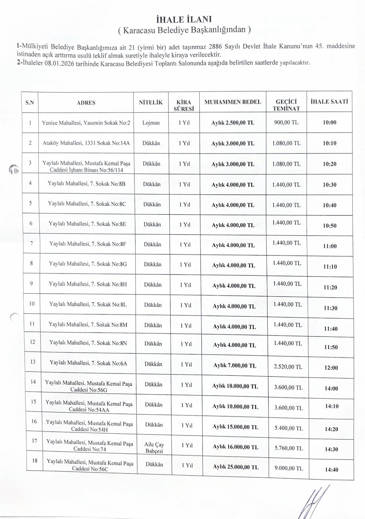 Belediyemize ait taşınmazlar, 2886 sayılı Devlet İhale Kanunu’nun 45. maddesi gereğince açık artırma usulüyle kiraya verilecektir.